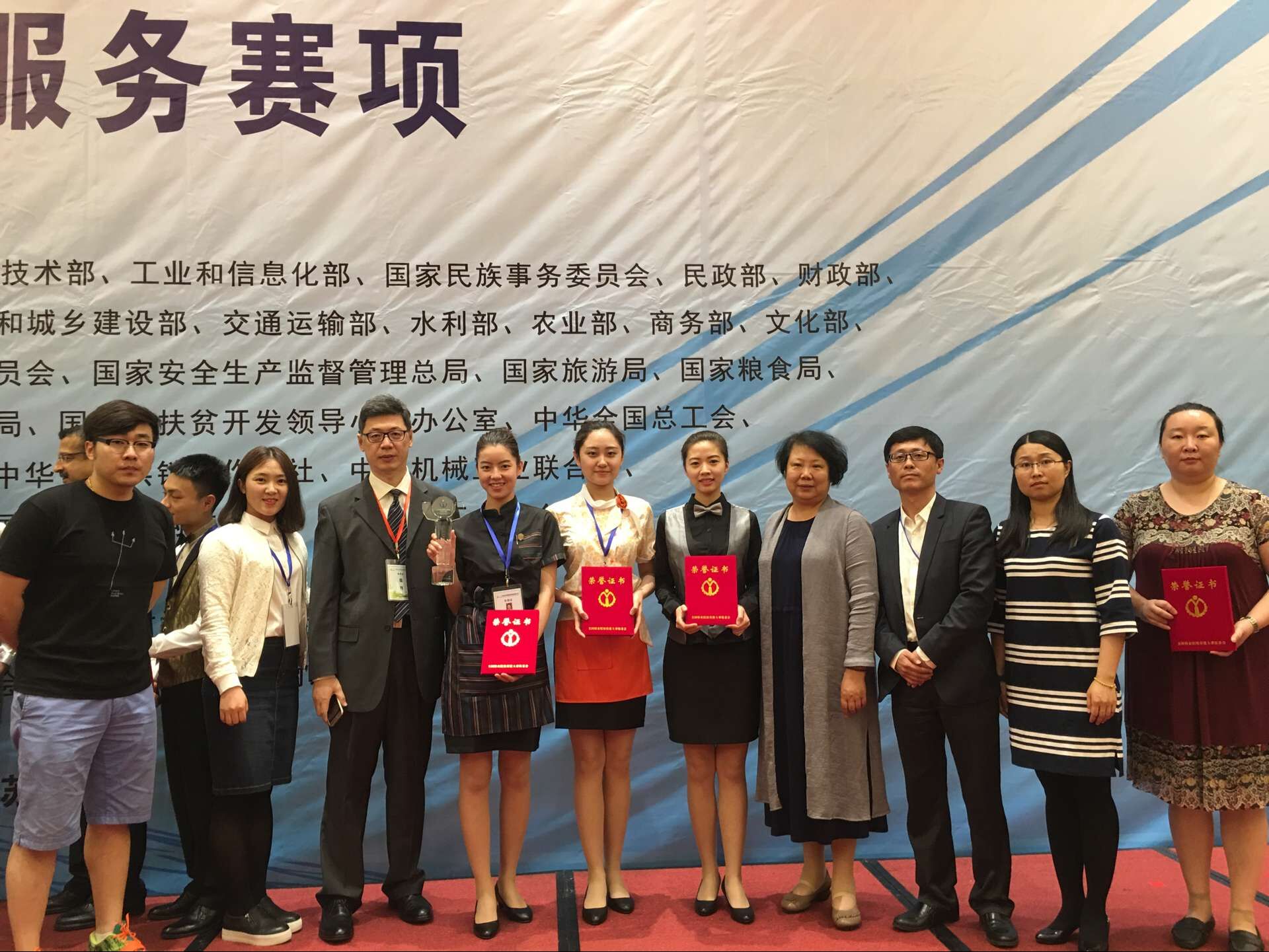 全国职业技能大赛是国家级的职业院校间的竞技平台,我院历来重视国家级技能大赛的参与和筹备工作,酒店管理学院张虹薇院长亲自带队赴南京参赛。酒店管理教研室梁瑜主任,专业教师沈洁、李鑫共同指导2015级酒店管理专业学生王野和陈晓雪两名同学备赛,并在比赛过程中全程指导。经过激烈的竞争和角逐,王野同学凭借扎实的专业基础、娴熟的操作技能和稳定的临场发挥,荣获大赛一等奖,这是我省自参赛以来获得的历史上最好成绩,同时,沈洁老师获得优秀指导教师荣誉;陈晓雪同学获得三等奖的好成绩,充分展示了我院学生积极向上、奋发进取的精神风貌和选手的整体实力。