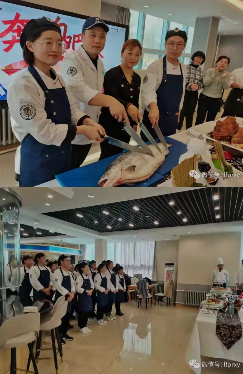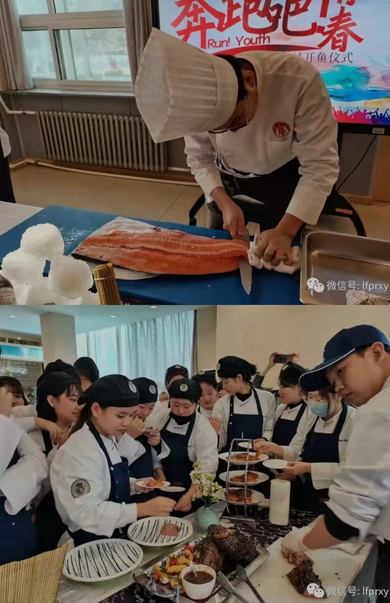 21级西餐在校学生参加了本次开鱼仪式,仪式期间,李华林女士为大家做蓝蛙企业宣讲,介绍企业基本情况、企业愿景、实习生的成长路径,让学生们更多的了解校企合作的情况。西餐专业孙静宇老师,巧手妙刀下对三文鱼进行分割,让学生们清楚看到三文鱼现场制作过程,享受味蕾与视觉的双重盛宴。