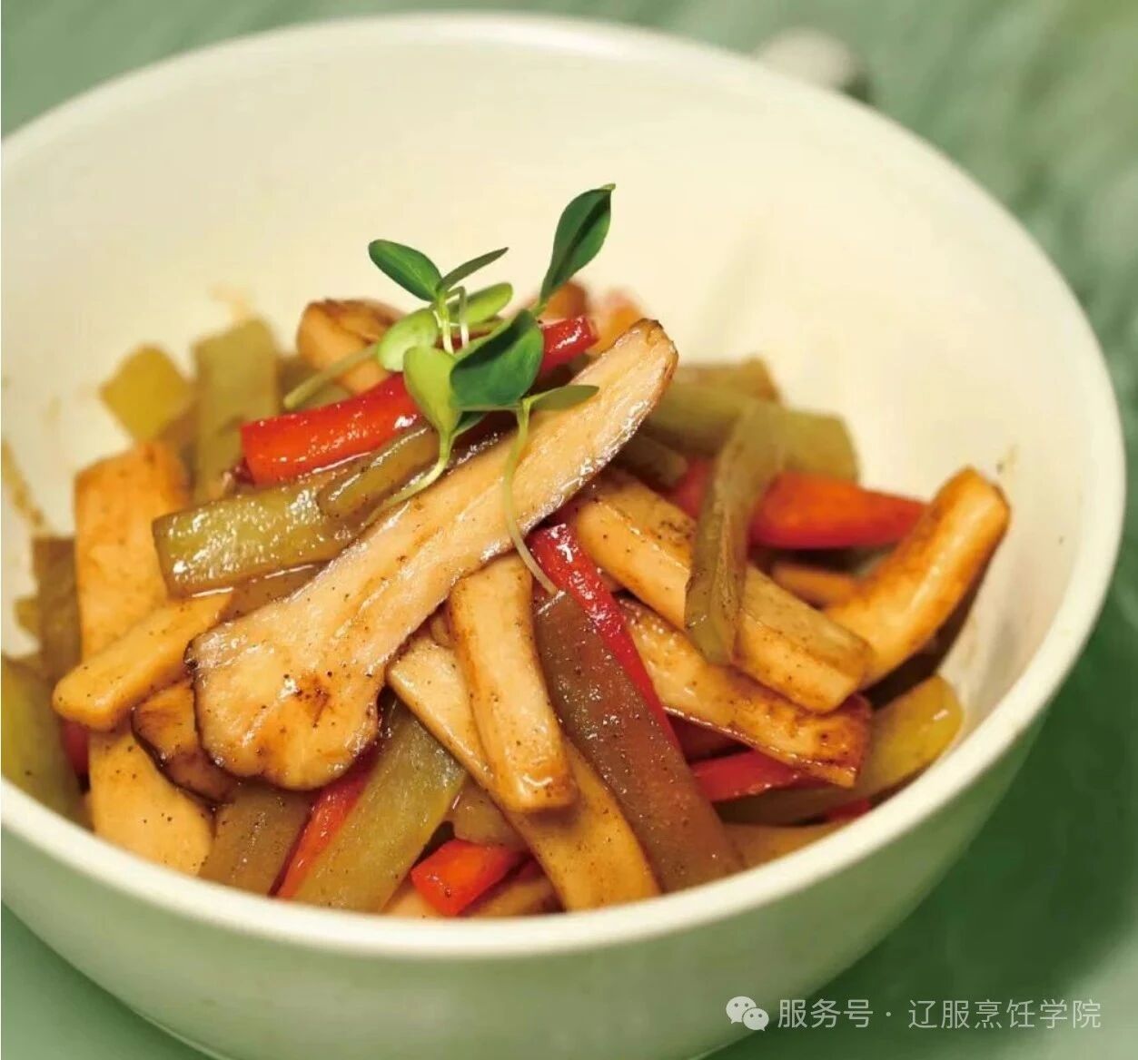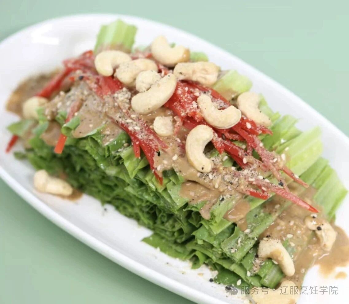 3.将其切好的油麦菜段摆盘,加入炒好的腰果、红柿子椒丝即可。