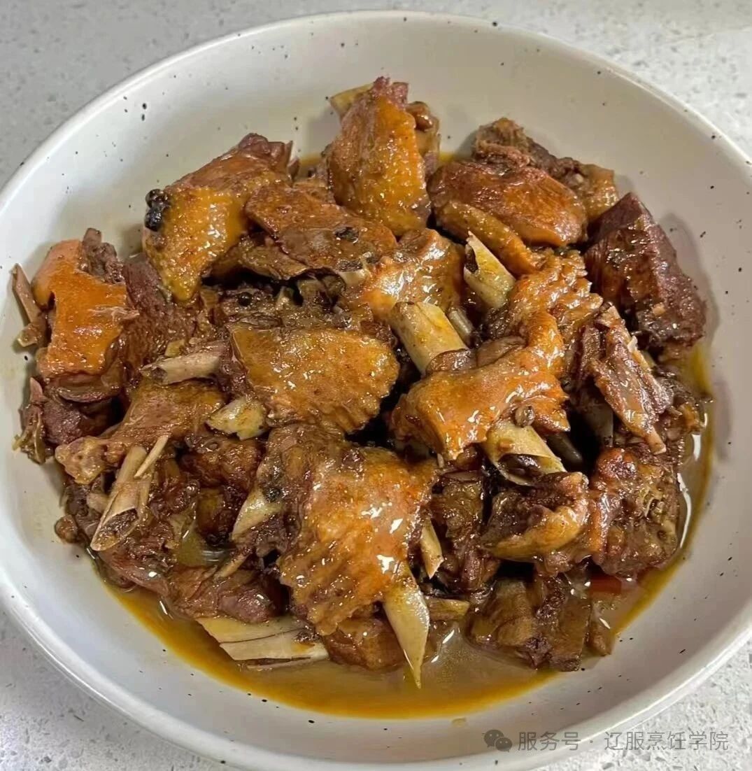 2.油热下葱姜爆香,倒鸭肉炒干水分。