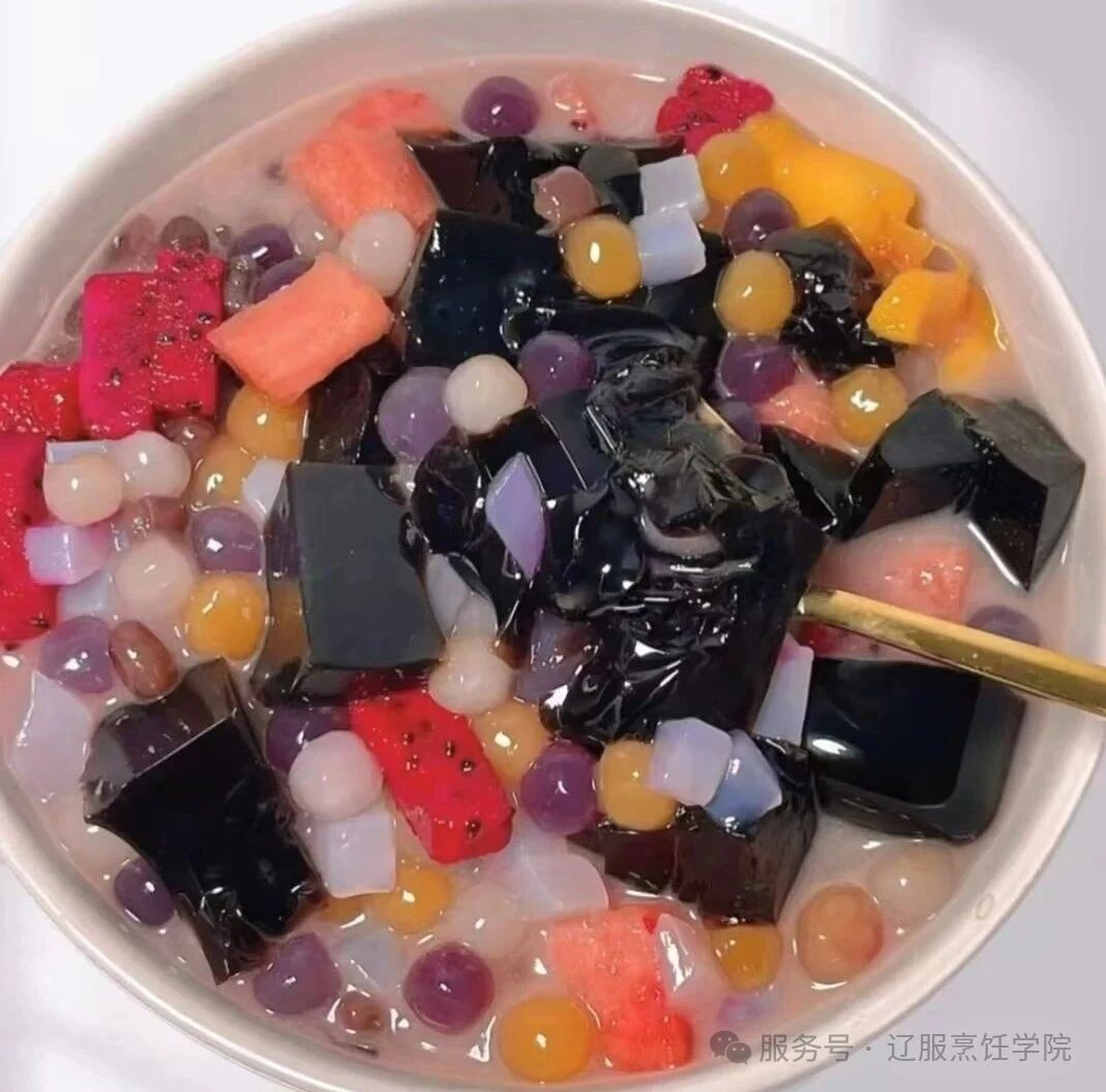 食材:烧仙草粉、椰奶、芋圆、椰果、备好的水果块。