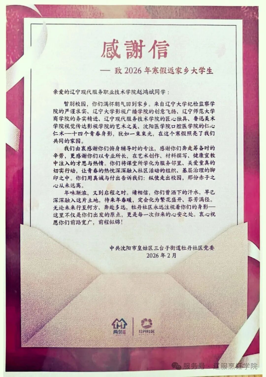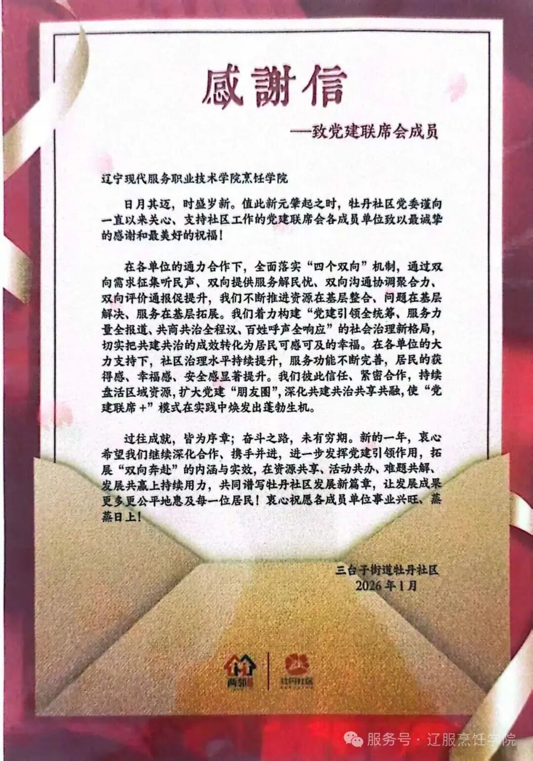 感谢信指出,烹饪学院长期深耕与社会的党建共建,全力落实听民声、解民忧、聚合力、互评价等“四个双向”机制,与社区协同推进烹饪技能下沉、餐饮文化传播、志愿服务升级,助力构建共建共治共享的基层治理新格局,为社区治理提质增效提供了坚实支撑。同时,社区对许兆全、赵鸿斌两名同学参与返家乡活动提出表扬,他们利用寒假扎根社区,结合专业特长开展健康宣传、教授儿童膳食知识、参与社区春晚策划与实施等基层实践,以青春行动服务邻里、奉献家乡,彰显了新时代烹饪学子的责任与担当。